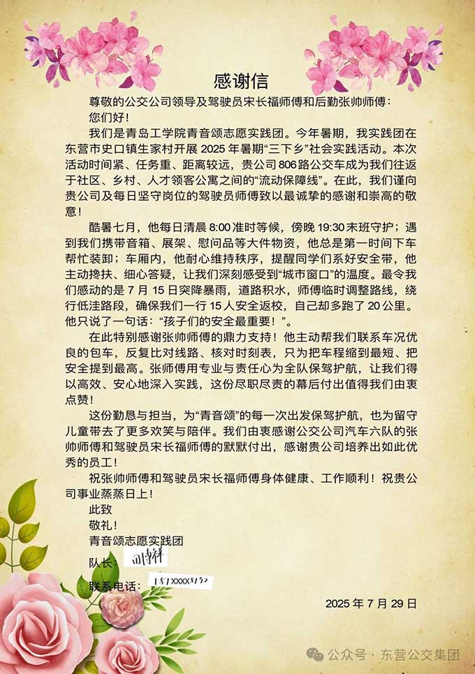 近日,青島工學院青音頌志愿團發(fā)來一封感謝信,感謝東營市公交集團駕駛員宋長福師傅熱情服務。原來,在今年...